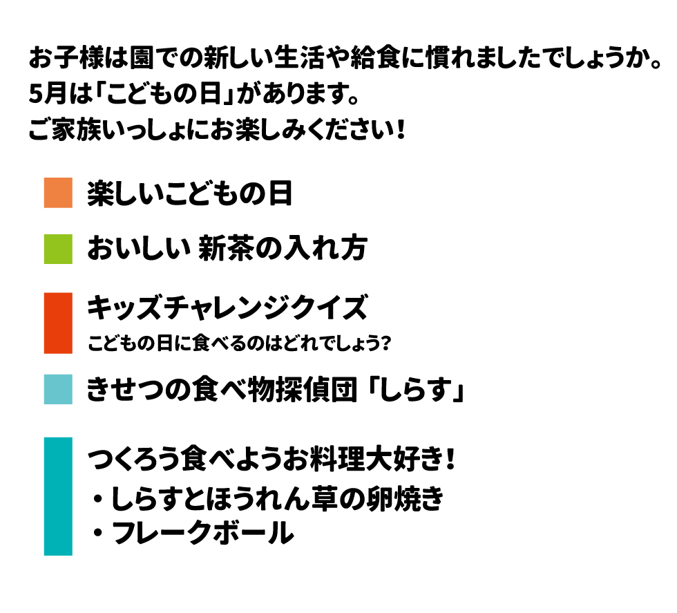 2026/04/25 2026年5月号 給食だより 子ども食育 Health+給食だより Tweet 今月号では、端午の節句の由来や縁起物の柏餅・粽を紹介しています。旬の「しらす」の栄養や新茶の美味しい入れ方に加え、親子で楽しめる「しらすの卵焼き」などのレシピも掲載しています! 子ども食育 Health+給食だより Tweet