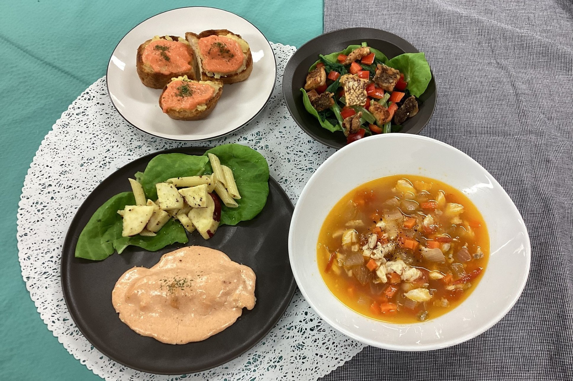 ・メニュー:たらこフランスパン、ヨーグルトでしっとり鯛グリル、鯛の皮揚げとわかめサラダ、鯛の洋風トマトあら汁